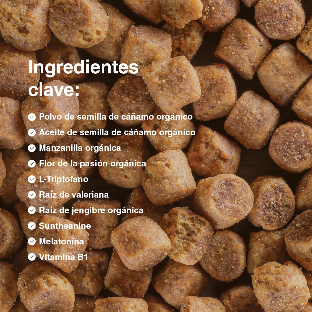 Proteínas de cáñamo ecológicas, aceite de cáñamo ecológico, manzanilla ecológica, calostro, pasiflora ecológica, L-triptófano, raíz de valeriana, raíz de jengibre ecológico, Suntheanine, melatonina, vitamina B1, aceite de coco, harina de avena, salvado de arroz, harina de arroz, semillas de lino, aroma natural de pato, lecitina de girasol, glicerina de coco, celulosa en polvo, ácido sórbico, extracto de romero, tocoferoles mixtos.