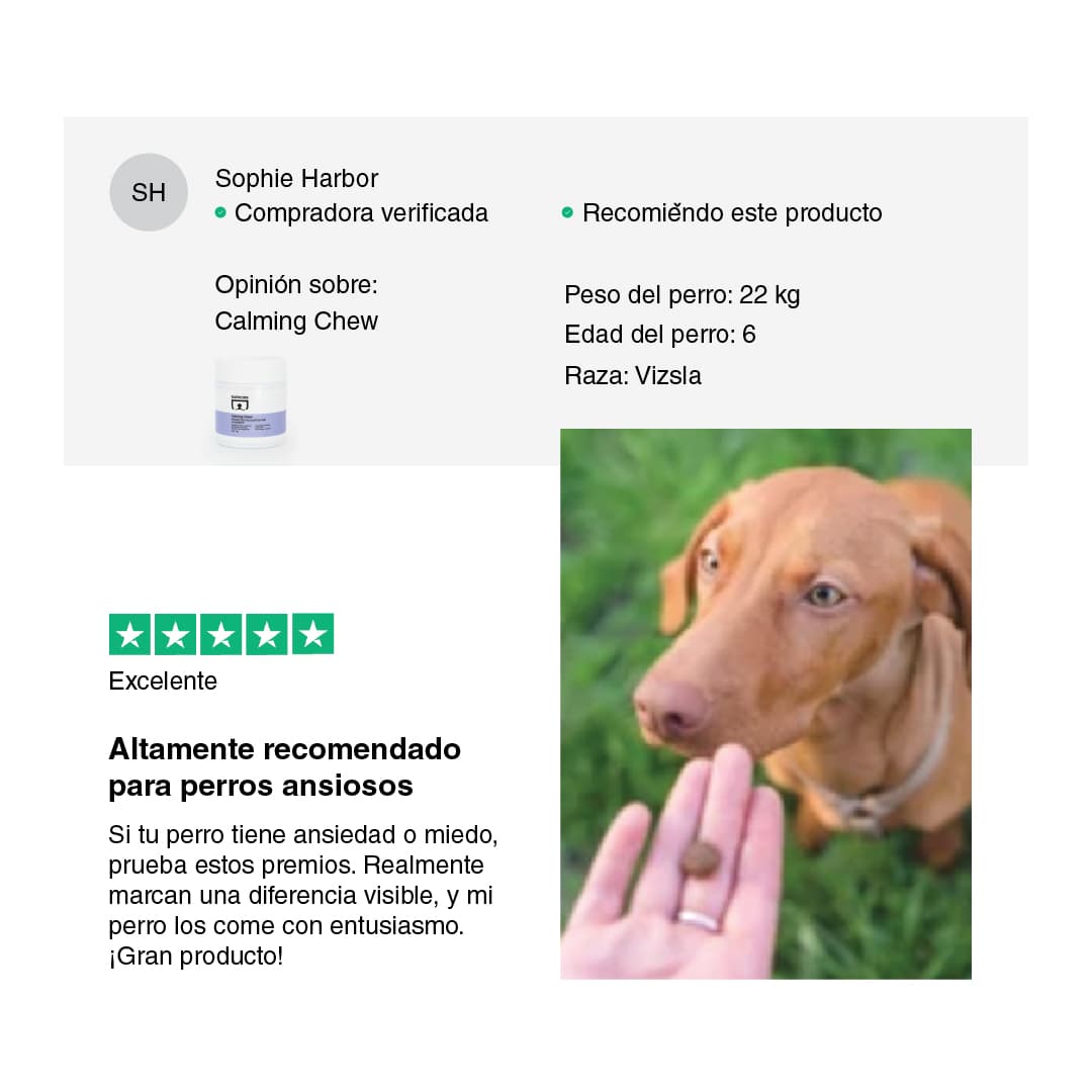 Mi perro solía tener mucho miedo a las tormentas, pero con Calming Chew está mucho más relajado. ¡Un producto excelente!